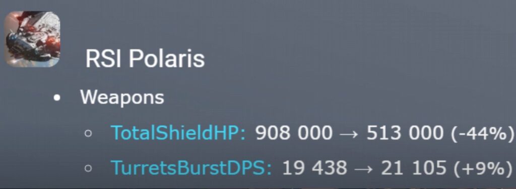 - HP Osłon RSI Polaris: Całkowite HP osłon RSI Polaris zostało drastycznie zmniejszone o 44% (z ponad 900 000 do 513 000). Jest to znacząca zmiana, zwłaszcza w kontekście jednoczesnego, znaczącego zwiększenia HP osłon innych dużych statków, jak np. Origin 890 Jump, którego osłony przekraczają teraz milion HP, częściowo dzięki wzmocnieniu osłony Glass (rozmiar 4, Industrial)
