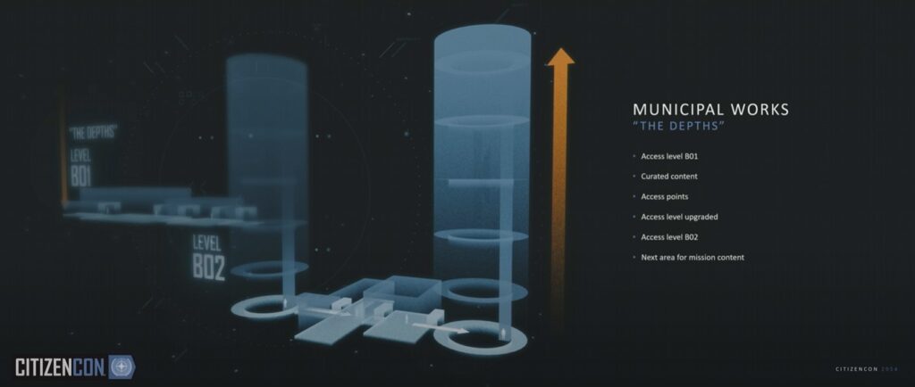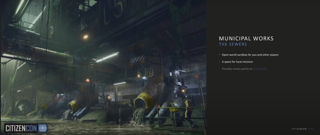 - Zawartość „Kanałów” A18 (teraz Municipal Works) – Zgodnie z opisem na CitizenCon, dwie główne warstwy z 3 dodatkowymi segmentami oznaczonymi jako „Rozdziały”. Przypis: Potwierdza wcześniej wyciekłe informacje, że jest to nowy kierunek dla ogólnego budowania wnętrz z bardziej odpowiednim tytułem „Kanały”.
